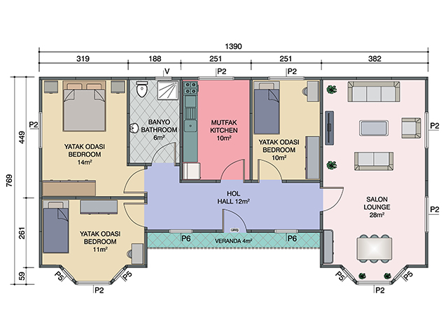 98 metrekare prefabrik ev özellikle yaşam anlayışına sahip olanlar için ideal evlerdir. Prefabrik ev, 250 cm tavan yüksekliğine sahiptir, pencereler PVC ile kaplıdır.